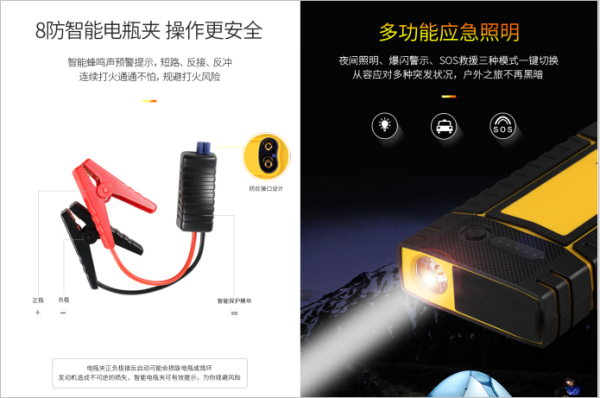市面上很少有哪一款产品可以做到八防,“AG庄闲集团点动”应急启动电源的智能电瓶夹做到了,防短路、防过充、防过放、防过压、防过流、防过温、防反充、防反接,不得不说,怎么把玩都不为过,相当的安全,不论是老司机还是小白都可以非常放心的使用,在8防智能电瓶夹的用料上,更是精挑细选,采用纯铜耐寒耐冻导电块,高硬度加厚铜夹子,加厚加长绝缘手柄,ABS防火级塑料,通过设计与用材等保障使用的安全。