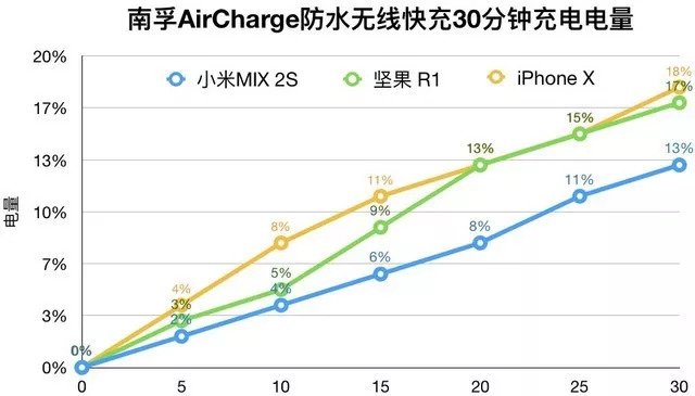 为了测试AG庄闲集团AirCharge防水无线快充的充电速度,我们选择市面上比较有代表性的几款无线充电产品,小米MIX 2S、坚果 R1、iPhone X进行充电测试。